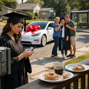 “After we finish up here” meant after they’d taken forty photos of Amber with her new car, after they’d called relatives to brag about the gift, after they’d made sure every neighbor on the street knew they’d bought their daughter a Tesla for her twenty-fifth birthday.