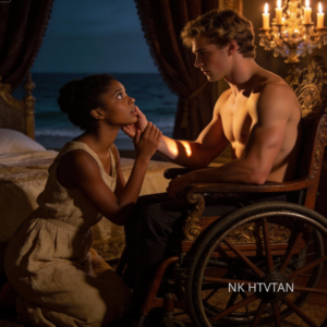 Sus manos descansan sobre sus propias rodillas y su mirada está fija en el rostro del príncipe. Él no la observa directamente. Parece absorto en un punto invisible, como si todavía estuviera midiendo el peso de lo que acaba de compartir. El crepitar de las velas acompaña el momento. Afuera, el mar golpea con suavidad un bbén constante que marca el ritmo de la respiración de ambos.