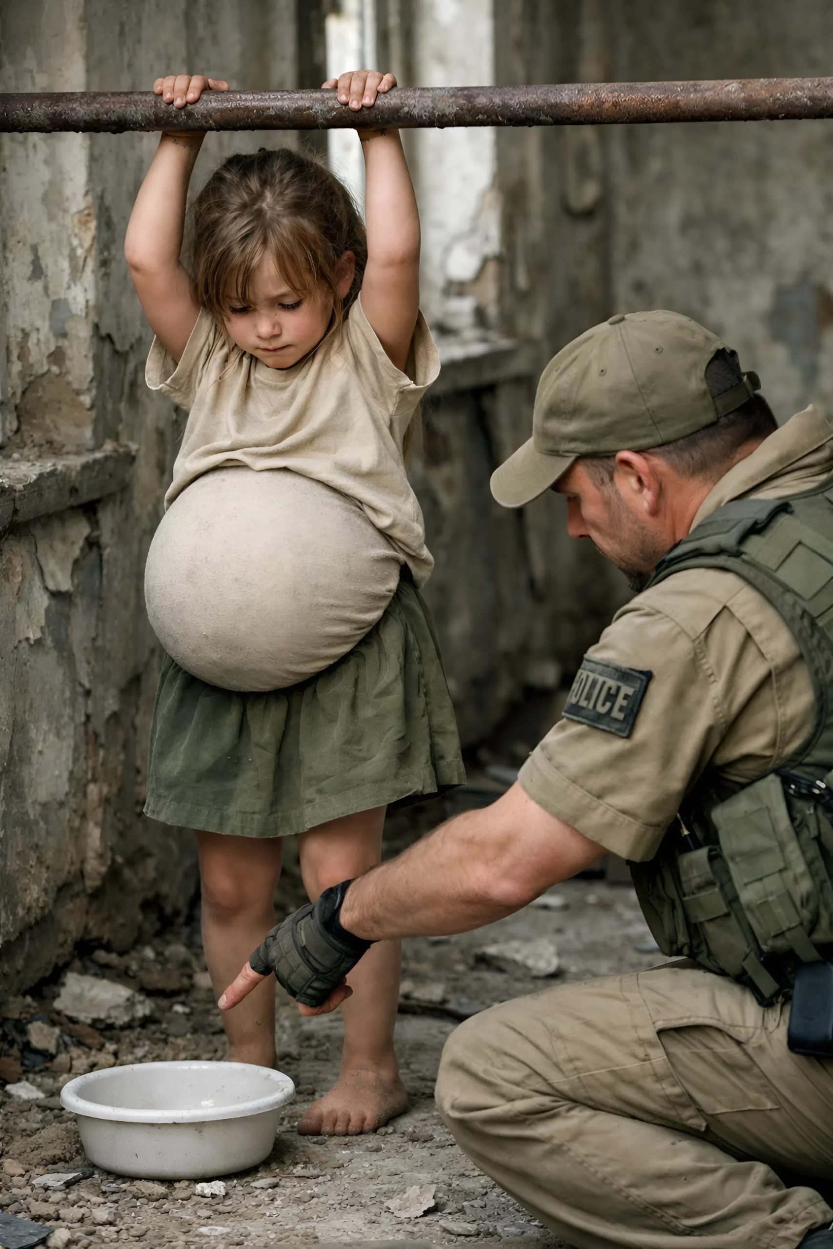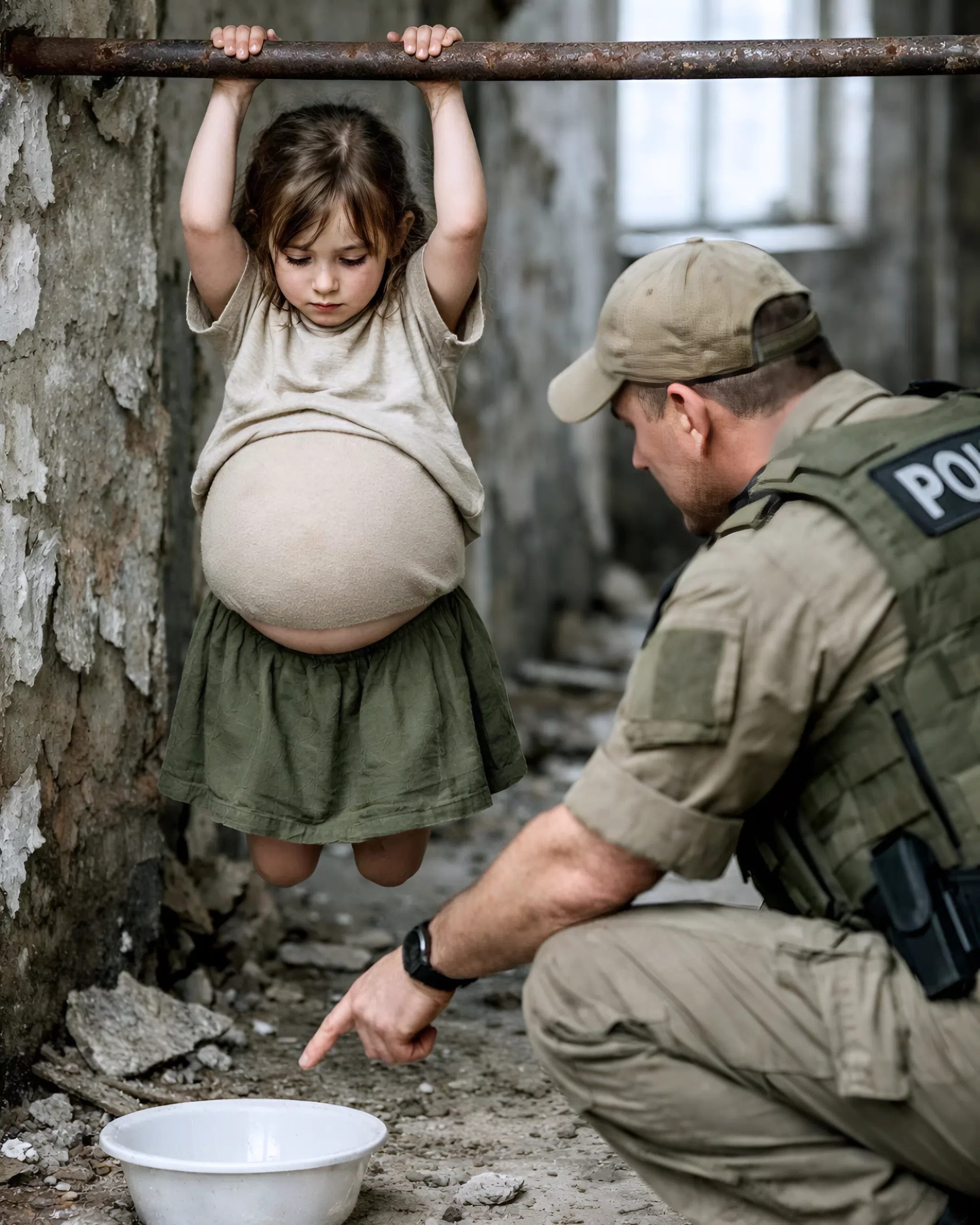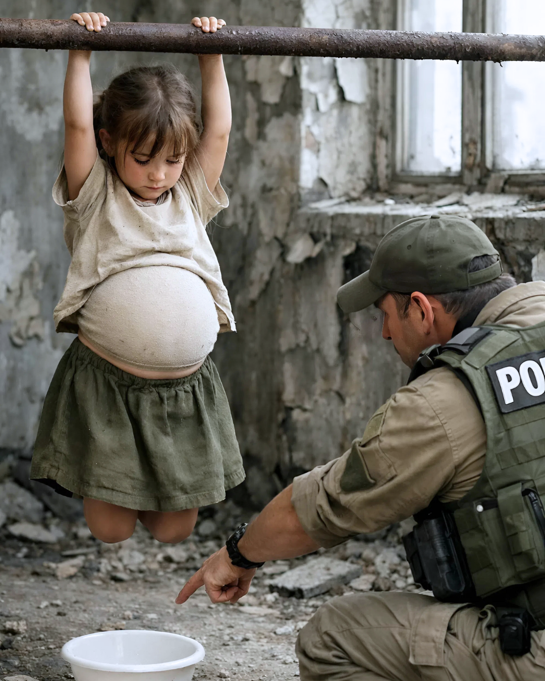 La niña estaba sentada en el suelo, de espaldas a la pared, abrazándose la barriga con las dos manos. Flaca, demasiado flaca. Pelo rubio enredado, ropita diminuta, ojos enormes. Pero lo que realmente te rompe el corazón… era la panza. Hincha de una forma que ni en mujeres a punto de parir se ve. Un globo tenso, fuera de lugar, como si el cuerpo dijera: «Aquí hay algo que no debería estar».