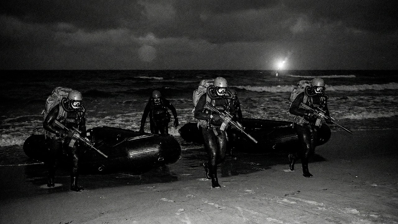 Pero si te fijas bien en la orilla, verás que la oscuridad del mar se mueve. De la espuma negra emergenas silenciosas. No son amantes ni turistas perdidos. Son sombras vestidas de neopreno negro goteando agua salada. Son comandos de la Shayet 13, la unidad naval de élite de Israel. Acaban de asegurar la playa. Detrás de ellos, botes de goma zodiac tocan la arena suavemente.